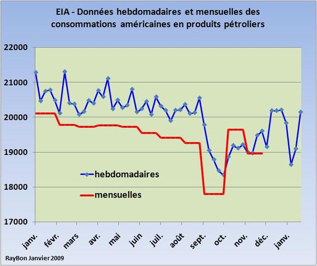 Les données hebdomadaires de consommations publiées par l’Energy Information Administration, sont malheureusement trop imprécises pour avoir une bonne estimation des consommations durant les mois de Décembre et de Janvier (FIG.II courbe bleue). Il se pourrait que les consommations soient supérieurs à 19 millions de barils/jour au mois de Décembre ce qui serait cohérent avec les baisses de prix et l’arrivée des frimas.