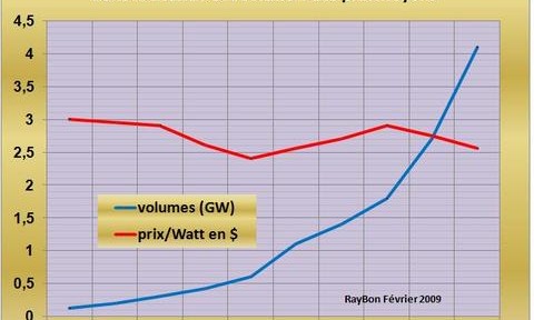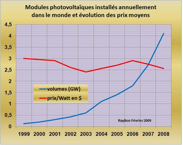 Sous l’influence d’une offre multiple et d’aides gouvernementales parfois excessives, comme en Allemagne ou en Espagne, l’industrie des modules solaires photovoltaïques a connu un trés fort développement durant ces dix dernières années. En 1999 le monde avait vu l’installation de 125 MW de modules solaires, en 2008 ce sont 4100 MW qui ont été mis en place. Ceci représente une croissance moyenne annuelle de 47% (FIG.). Une telle croissance couplée aux perfectionnements des technologies, à l’arrivée de nouvelles solutions, à la montée en puissance d’opérateurs chinois aurait du se concrétiser par une baisse régulière des prix accompagnant l’expérience cumulée de la filière. Or, il n’en a rien été, on a même vu en 2004,2005 et 2006 les prix moyens croître sous la poussée de la pénurie en Silicium et de la montée des cours de ce produit de base (FIG.). Mais ce phénomène n’a en rien dégonflé la demande sponsorisée par ailleurs par de copieuses aides gouvernementales qui ont fait flamber la demande. Voila pour le passé et ses distorsions de marché, mais l’avenir semble aujourd’hui moins rose pour toute la filière.