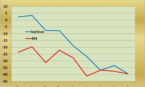 Le mois de Janvier n’est traditionnellement pas un bon mois pour les ventes de voitures aux Etats-Unis. Cette année, ce pays a connu le pire avec 655 mille voitures vendues contre 1,04 million en Janvier 2008. Les ventes moyennes par jour chutent de 39% avec toujours la même hiérarchie: -50% pour le cumul des trois « maigres » américaines, -28% pour les constructeurs asiatiques et -25% pour les constructeurs allemands. Les 4X4 et les berlines sont également touchés par le marasme ambiant. Au mois de Décembre, un léger frémissement des ventes de berlines avait été perçu, les ventes de Janvier démentent toute hypothèse de reprise (FIG.). Il semble cependant que le commerce des voitures américain ait atteint le fond de la piscine.