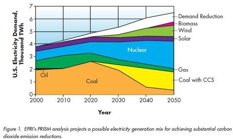 L‘Electric Power Research Institute (EPRI) et l’Idaho National Laboratory (INL) viennent de publier un Plan Stratégique de Recherche et Développement dans le domaine des activités énergétiques nucléaires civiles. Ils placent tout d’abord leur action dans le cadre des objectifs de réduction vigoureuse des émissions de CO2 au niveau de 1990 en 2020 et d’une réduction supplémentaire de 80% en 2050. La traduction de ces objectifs dans le mix énergétique de production d’électricité américain, réalisé par une analyse appelée PRISM (FIG.), implique un accroissement des parts du nucléaire dans le mix de 20% à 40% entre aujourd’hui et 2050. Dans ce scénario, pour la première fois aux Etats-Unis, il est affirmé par un organisme officiel que malgré l’accroissement des énergies renouvelables, malgré la disponibilité des moyens de capture et de stockage du CO2 (CCS) pour 10$ la tonne de CO2, il sera indispensable de faire croître la part d’électricité d’origine nucléaire au cours du XXIème siècle. Les temps changent!