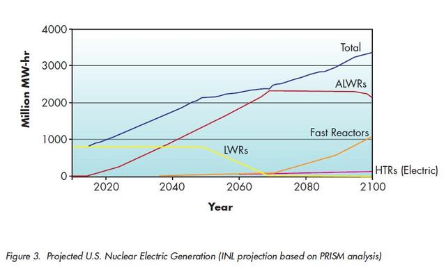 Dans un tel schéma la puissance installée des réacteurs à eau légère de nouvelle génération (ALWR) augmenterait régulièrement jusqu’en 2070, accompagnant la disparition des réacteurs (LWR) de la génération précédente (FIG.II). Puis arriverait la phase commerciale des réacteurs à neutrons rapides qui prendrait le relais (Fast Reactors). Par ce cadencement l’INL donne le temps (plusieurs décennies) de mettre au point les réacteurs surgénérateurs qui permettraient d’utiliser les combustibles usagés de la génération précédente. La consommation d’Uranium passerait par un maximum de 50 mille tonnes par an entre 2060 et 2080.
