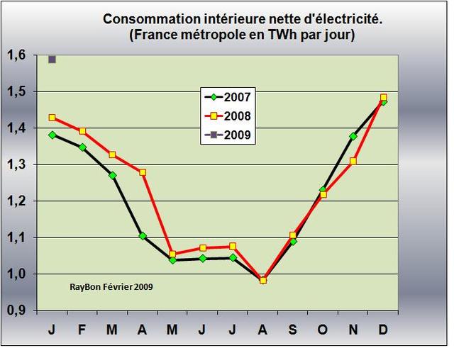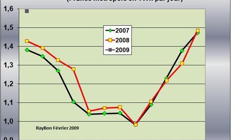 D’après les données de RTE, la consommation nette d’électricité de la France métropolitaine au mois de Janvier, s’est élevée à 1,59 TWh par jour, en croissance de 11% par rapport au même mois de 2008 (FIG.). Cette forte croissance est attribuable aux appels du réseau qui se sont accrûs de 15,6% en raison du froid. Il a fait en moyenne 4,1°C de moins en Janvier 2009 qu’en Janvier 2008. Par contre la consommation des gros clients industriels s’est tassée de 15%, tout comme elle l’avait fait au cours des deux mois précédents. La production d’électricité d’origine nucléaire à 1,39 TWh/jour a progressé de 5,3% par rapport à il y a un an. Le solde des échanges avec l’extérieur est resté globalement positif avec 2,7 TWh pour l’ensemble du mois. Enfin, 90,2% des injections de courant au mois de Janvier sur le réseau RTE provenaient de sources n’émettant pas de CO2 (le meilleur score en 2008, a été atteint au mois d’Août avec 97,3%).
