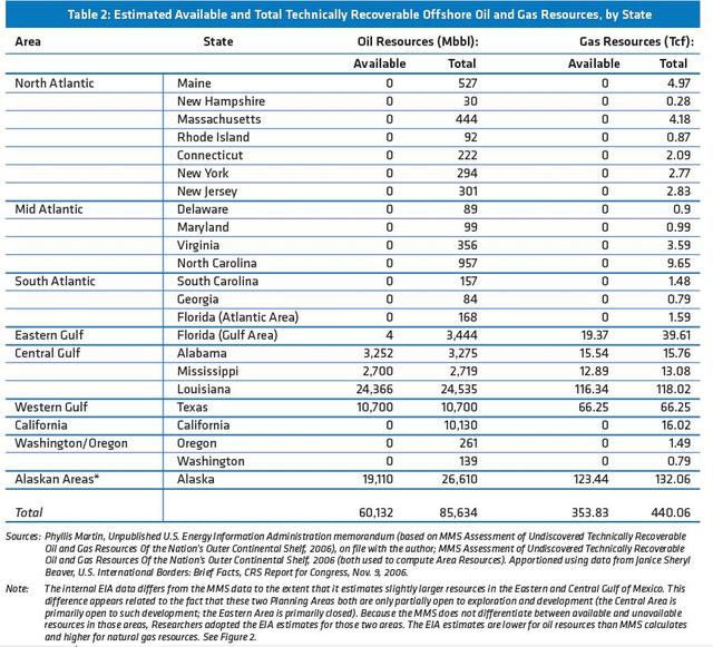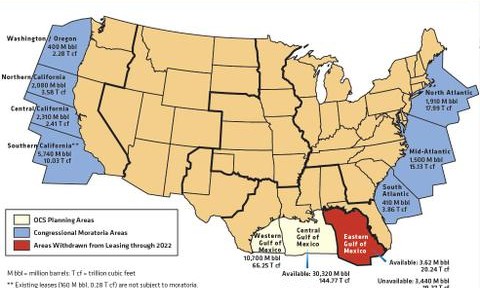 Une étude publiée par l’American Energy Alliance, largement documentée à partir d’études et de données de l’Administration américaine difficilement contestables, relance vivement le débat de l’exploitation des gisements offshore au large des côtes américaines. Cette étude porte exclusivement sur les retombées économiques qui proviendraient d’une totale libéralisation des processus de recherche et d’exploitation des gisements non encore accessibles. Les plus importantes réserves estimées qui seraient rendues disponibles se trouvent au large de la Californie (10 milliards de barils), au large de la Floride côté Golfe du Mexique (zone en rouge sur la carte, avec 3,4 milliards de barils) et au large de l’Alaska (7,5 milliards de barils de plus). Les conclusions de cette étude, en période de crise, rappellent l’importance économique des retombées qui seraient à en attendre.