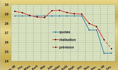 Une Société comme Petrotrologistics suit le mouvement des pétroliers dans le monde et leur programme dans les semaines à venir. Elle est donc en parfaite position pour anticiper les livraisons de pétrole dans le monde. C’est ainsi qu’elle annonce que les livraisons de l’OPEC au mois de Février atteindront 25,32 millions de barils de pétrole par jour, soit un excès de livraison de 0,48 million de barils par rapport aux quotas en vigueur. Mais ce flux est tout de même inférieur d’un million de barils/jour à celui du mois de Janvier (FIG.). Cette discipline inhabituelle des membres de l’OPEP est le signe de leur volonté de vouloir maintenir le marché du pétrole à des niveaux de prix décents.
