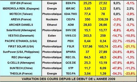 La semaine boursière du green-business n’a pas été bonne, une de plus me direz-vous! Pour cette dernière semaine du mois de Février, la publication du chiffre d’affaires de THEOLIA, obligée de retraiter ses chiffres de 2007, pour raison d’annulation de ventes à un acquéreur insolvable en 2008, fait une très mauvaise impression. Le cours de l’action plonge de 24% d’une semaine à l’autre. Notons également le recul de First Solar aux Etats-Unis, le marché très pessimiste sur l’avenir du photovoltaïque abandonne ses champions un à un. Finalement ce sont les deux sociétés adossées à de grands Groupes comme EDF EN ou Iberdrola REN. qui réussissent à surnager dans la tempête. Quand à AREVA embourbée dans son premier EPR finlandais et qui devra boucler un jour, d’une façon ou d’une autre, le départ du capital de Siemens, elle démontre que son modèle économique intégré est le bon, avec un accroissement du carnet de commande de 21% à 48 milliards d’euros.