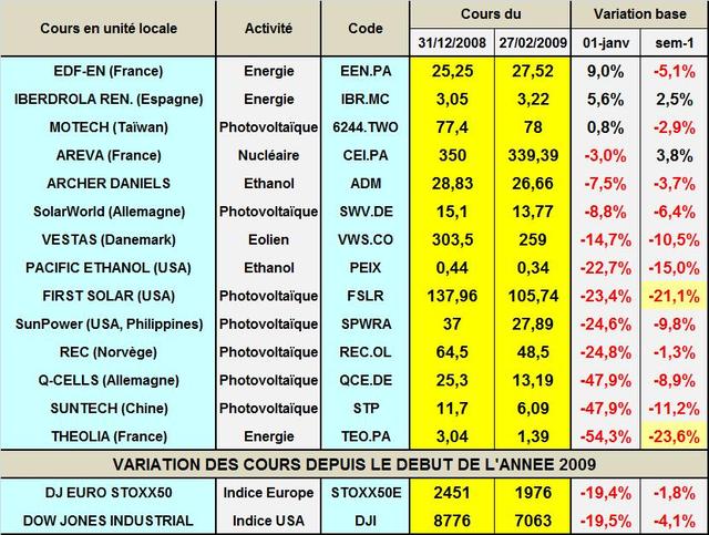 La semaine boursière du green-business n’a pas été bonne, une de plus me direz-vous! Pour cette dernière semaine du mois de Février, la publication du chiffre d’affaires de THEOLIA, obligée de retraiter ses chiffres de 2007, pour raison d’annulation de ventes à un acquéreur insolvable en 2008, fait une très mauvaise impression. Le cours de l’action plonge de 24% d’une semaine à l’autre. Notons également le recul de First Solar aux Etats-Unis, le marché très pessimiste sur l’avenir du photovoltaïque abandonne ses champions un à un. Finalement ce sont les deux sociétés adossées à de grands Groupes comme EDF EN ou Iberdrola REN. qui réussissent à surnager dans la tempête. Quand à AREVA embourbée dans son premier EPR finlandais et qui devra boucler un jour, d’une façon ou d’une autre, le départ du capital de Siemens, elle démontre que son modèle économique intégré est le bon, avec un accroissement du carnet de commande de 21% à 48 milliards d’euros.