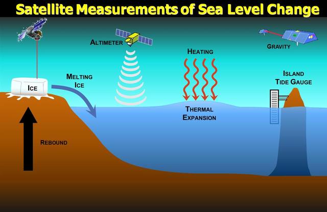 Quantifier l’ampleur des changements climatiques dans le monde n’est pas très facile. Il est cependant un indicateur indirect difficilement contestable: le niveau moyen des océans qui résulte à la fois de la déperdition du volume d’eau et de glace en réserve sur les continents et des phénomènes de dilatation thermique dans l’hypothèse d’un réchauffement global des masses d’eau océaniques (FIG.I). Les mesures satellitaires de plus en plus précises des niveaux des océans, par les satellites TOPEX puis JASON, permettent d’affirmer que le niveau moyen augmente de plus de 3mm par an (FIG.II).