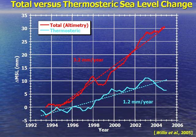 Si l’on en croit ces hypothèses, en sachant que la dilatation thermostérique des océans intervient pour un tiers environ du phénomène global (FIG. III, courbe bleue), cela veut dire que l’augmentation du niveau moyen des océans de plus de 3 mm par an devrait se poursuivre durant des décennies.