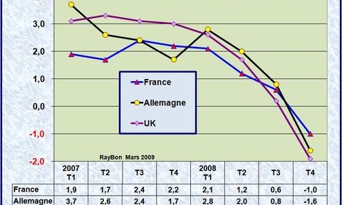 Les variations trimestrielles des PIB, par rapport au même trimestre de l’année précédente,  publiées par Eurostat, montrent que le phénomène de chute du PIB pour les grandes nations européennes, enregistré au quatrième trimestre 2008, s’inscrit dans le contexte de moindre croissance enregistré auparavant. Le cas de la Grande-Bretagne par exemple illustre ce propos avec une chute aux allures paraboliques (courbe parme) des variations du PIB de plus de 3% en début 2007 à -2% en fin 2008. Conséquences du formidable  déclin de la Finance anglo-saxonne. Pour l’Allemagne (courbe noire) le recul des derniers trimestres est encore plus net, passant de +2,8% à -1,6% en trois trimestres. L’activité industrielle liée aux exportations de ce pays est en net recul. Paradoxalement la médiocrité économique de la France, engoncée dans ses protections, semble la protéger des grands malheurs. Certains s’en réjouiront, mais suivra-t-elle le jour de la reprise? Les centaines de milliers d’Intérimaires et de CDD qui ont perdu ou qui vont perdre leur job et qui paient pour les autres, peuvent en douter.Pib2008t4
