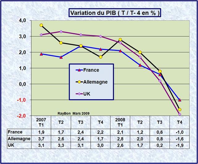 Les variations trimestrielles des PIB, par rapport au même trimestre de l’année précédente,  publiées par Eurostat, montrent que le phénomène de chute du PIB pour les grandes nations européennes, enregistré au quatrième trimestre 2008, s’inscrit dans le contexte de moindre croissance enregistré auparavant. Le cas de la Grande-Bretagne par exemple illustre ce propos avec une chute aux allures paraboliques (courbe parme) des variations du PIB de plus de 3% en début 2007 à -2% en fin 2008. Conséquences du formidable  déclin de la Finance anglo-saxonne. Pour l’Allemagne (courbe noire) le recul des derniers trimestres est encore plus net, passant de +2,8% à -1,6% en trois trimestres. L’activité industrielle liée aux exportations de ce pays est en net recul. Paradoxalement la médiocrité économique de la France, engoncée dans ses protections, semble la protéger des grands malheurs. Certains s’en réjouiront, mais suivra-t-elle le jour de la reprise? Les centaines de milliers d’Intérimaires et de CDD qui ont perdu ou qui vont perdre leur job et qui paient pour les autres, peuvent en douter.Pib2008t4
