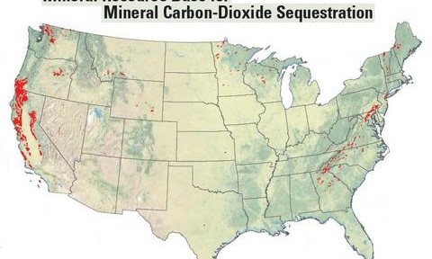 Certaines roches comme le basalte ou certaines roches mafiques, remontées des entrailles de la Terre lors de mouvements tectoniques, présentent la faculté de pouvoir opérer une séquestration minérale du CO2 par réaction chimique. Des roches comme la péridotite, la dunite et autres, réagir avec le CO2 pour former des carbonates. Des géologues américains viennent d’établir une carte détaillée des Etats-Unis pour recenser ces gisements de roches particulièrement abondants dans les Etats de l’Ouest (Californie, Oregon, Washington) et dans l’Est tout au long de la ceinture des Appalaches de Terre-Neuve à l’Alabama (FIG.I, points rouges sur la carte).