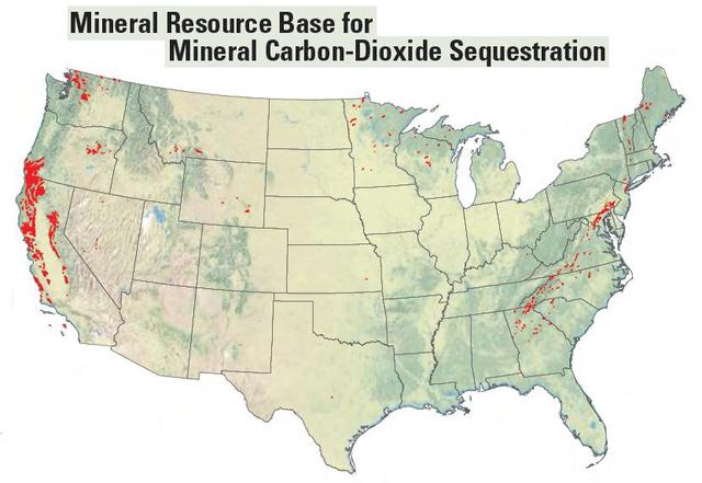 Certaines roches comme le basalte ou certaines roches mafiques, remontées des entrailles de la Terre lors de mouvements tectoniques, présentent la faculté de pouvoir opérer une séquestration minérale du CO2 par réaction chimique. Des roches comme la péridotite, la dunite et autres, réagir avec le CO2 pour former des carbonates. Des géologues américains viennent d’établir une carte détaillée des Etats-Unis pour recenser ces gisements de roches particulièrement abondants dans les Etats de l’Ouest (Californie, Oregon, Washington) et dans l’Est tout au long de la ceinture des Appalaches de Terre-Neuve à l’Alabama (FIG.I, points rouges sur la carte).