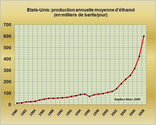 L‘industrie de l’éthanol de maïs américaine a vécu, comme bien d’autres, une année 2008 agitée. Prise en ciseau entre des cours du maïs manipulés par la spéculation sur les matières premières agricoles durant les huit premiers mois et les cours de l’éthanol en chute libre en fin d’année, accompagnant la chute des cours de l’essence, nombreux sont ceux qui ont du fermer des usines ou même se mettre en faillite. Ce fut le cas de VERASUN victime de ses achats à terme de maïs au plus haut. Malgré ces vicissitudes, la production moyenne d’éthanol a atteint 600 mille barils par jour en 2008 (FIG.) avec des flux de production de plus de 700 mille barils par jour au mois de Décembre. Les volumes produits ont été multipliés par six durant les 8 ans de l’Administration Bush.Ethanolusaprod19802008