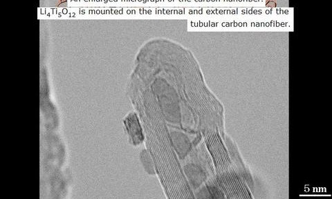 Ce produit inclut de très fines particules de Li4Ti5O12 à l’intérieur et à l’extérieur de la nanofibre peut être chargé en Li7Ti5O12 ou déchargé en 12 secondes.