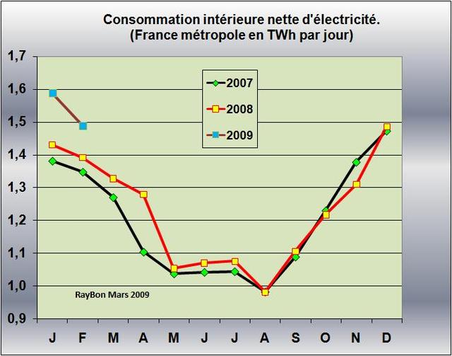 RTE nous apprend que la consommation nette d’électricité en France a atteint 41,7 TWh au mois de Février et 90,9 TWh en cumulé sur Janvier et Février. Ce dernier résultat est en augmentation de 7% par rapport à celui de l’an dernier où la consommation nette cumulée avait atteint 84,7 TWh (FIG.). La raison principale de cette embellie: la baisse des températures qui a effacé tous les reculs de consommations dues à la faible activité économique. Cette forte progression des consommations devrait permettre à EDF de présenter au mois d’Avril prochain, un Chiffre d’Affaire trimestriel en bonne hausse pour la France. Au mois de Février 90,5% de l’électricité produite en France n’a pas généré de CO2. Le solde des échanges d’énergie électrique avec nos voisins européens est resté positif et à atteint 6 TWh en cumulé pour les deux premiers mois de l’année.