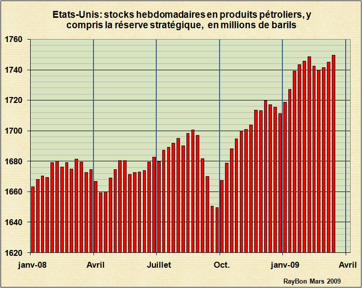 Les stocks hebdomadaires américains de pétrole montent et les prix s’apprécient. Tout se passe comme si le pétrole brut et les produits pétroliers étaient perçus par la spéculation comme de bon refuges pour se protéger de l’affaiblissement du dollar et de l’inflation américaine annoncée. Alors les spéculateurs stockent du pétrole et l’Administration reconstitue sa Réserve Stratégique en ces périodes de faible consommation (FIG.).