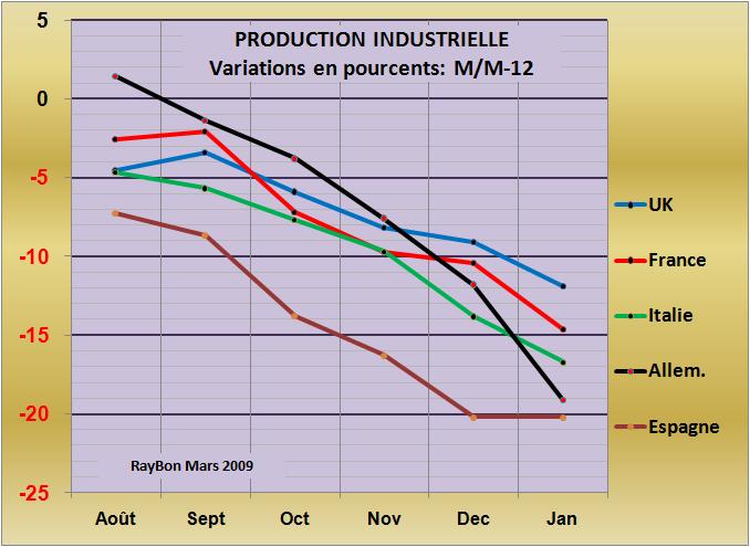Eurostat avait prévenu que les entrées de commandes en Allemagne aux mois de Novembre et Décembre avaient été très mauvaises, dans les 28% inférieures à celles des mêmes mois enregistrées un an plutôt. La production industrielle qui en est résulté, enregistrée au mois de Janvier à -19% par rapport à il y a un an confirme cette tendance. Ce qui est spectaculaire dans les résultats de l’activité industrielle allemande c’est leur chute aux allures paraboliques (FIG., courbe noire) qui indique que la vitesse de freinage industriel est de plus en plus forte. En comparaison la France, la Grande-Bretagne et l’Italie affichent des décroissances de leur activité industrielle sensiblement linéaires. Quand à l’Espagne il semblerait que la décroissance est atteint un plateau à -20% par rapport à il y a un an. Les diverses mesures de relances style prime à la casse qui ont un puissant effet sur l’activité automobile seront les bienvenues par la suite.