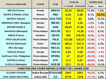 Dans un cadre industriel fortement déprimé, les actions du green business ont du mal à tirer leur épingle du jeu. Cependant il a été possible d’assister à la croissance de plus de 65% du cours de Pacific Ethanol, penny stock du biofuel, qui fait fonctionner une seule de ses quatre usines. La vente aux enchères disputée des 17 usines de VeraSun (LIRE) a sûrement joué dans ce processus de brusque valorisation. La remontée des cours de l’essence vers les 1,5 $ le gallon sur le NYMEX permet également d’anticiper une stabilisation, sinon une reprise, des prix du fuel éthanol qui se traite autour des 1.66$/gallon dans les Etats de la corn-belt. Notons également dans le photovoltaïque le bon comportement du taïwanais Motech qui reprend 12% sur la semaine et la cession de rattrapage de l’allemand Q-Cells qui récupère 15%, tout en restant le bon dernier du classement de l’échantillon. Enfin il faut relever le bon comportement d’EDF EN qui progresse de 7,5%.
