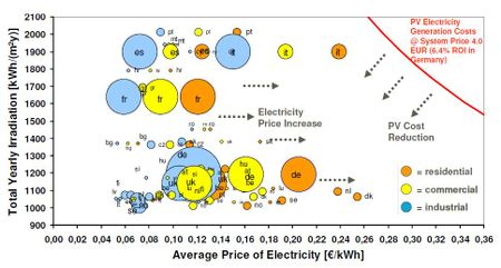 La stratégie des industries du photovoltaïque est donc d’atteindre cette « grid parity » dans les pays du Sud de l’Europe qui profitent de près de 2000 heures d’ensoleillement et parmi eux celui qui possède les prix les plus élevés: c’est l’Italie. C’est en Italie que se dérouleront les premières grandes manoeuvres du photovoltaïque mondial non subventionné. Ce n’est donc pas par hasard si Sharp a décidé d’implanter sa future usine européenne de modules en couches minces en Italie.