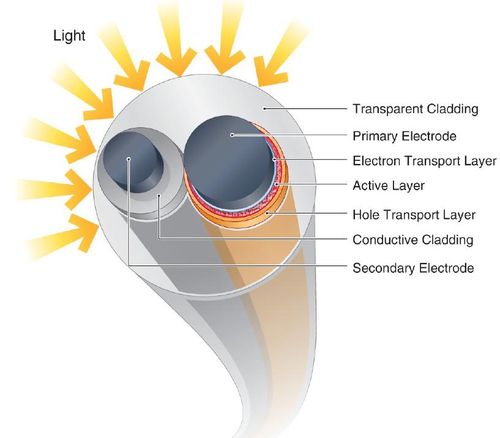 Les chercheurs de Konarka Technologies, Lowell (MA), sûrement un des Groupes au monde, les plus créatifs du moment dans les technologies photovoltaïques, ont imaginé de créer des fibres aux propriétés photoélectriques avec des rendements de conversion de l’ordre de 3%. Ces cellules sont constituées de deux fibres, l’une conductrice qui par contact, collecte les électrons générés par l’autre fibre comportant un mélange organique aux propriétés photovoltaïques. Ce mélange nanostructuré donnant lieu à une hétérojonction entre un polymère qui, après excitation par la lumière, devient donneur d’électrons et un fullerène substitué accepteur d’électrons, est obtenu par la mise en solution des deux composants dans un co-solvant et enduction d’un fil conducteur (FIG.).