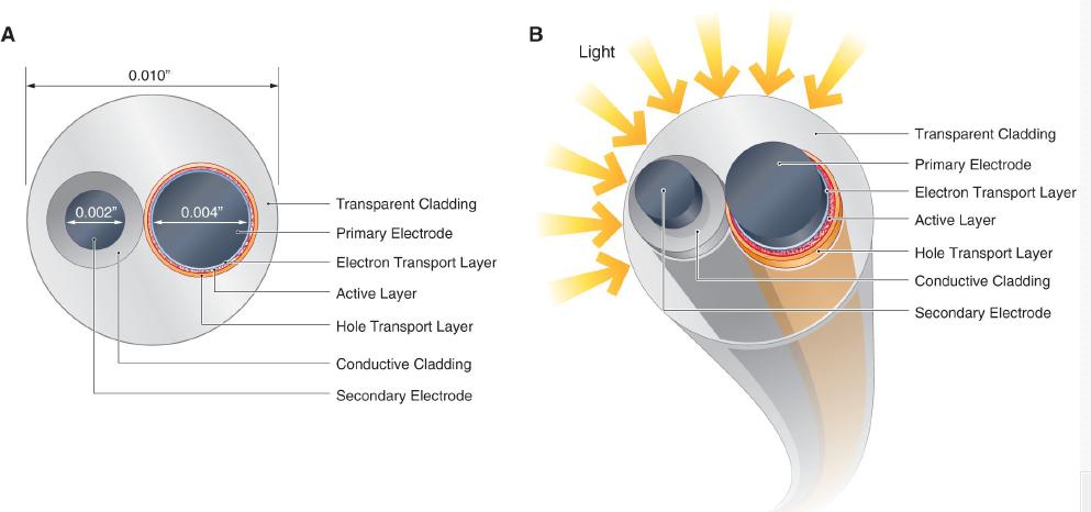 Les chercheurs de Konarka Technologies, Lowell (MA), sûrement un des Groupes au monde, les plus créatifs du moment dans les technologies photovoltaïques, ont imaginé de créer des fibres aux propriétés photoélectriques avec des rendements de conversion de l’ordre de 3%. Ces cellules sont constituées de deux fibres, l’une conductrice qui par contact, collecte les électrons générés par l’autre fibre comportant un mélange organique aux propriétés photovoltaïques. Ce mélange nanostructuré donnant lieu à une hétérojonction entre un polymère qui, après excitation par la lumière, devient donneur d’électrons et un fullerène substitué accepteur d’électrons, est obtenu par la mise en solution des deux composants dans un co-solvant et enduction d’un fil conducteur (FIG.).