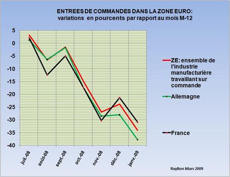 Après un mois de Décembre en trompe l’oeil qui laissait supposer que les baisses d’entrées de commandes dans l’industrie de la Zone Euro allaient se stabiliser, les chiffres du mois de Janvier viennent cruellement démentir ce diagnostic. Par rapport au même mois de l’année précédente, elles chutent de 38% pour l’Allemagne, de 31% pour la France et se retrouvent entre les deux à -34% pour l’ensemble de la Zone Euro (FIG.). Ces valeurs n’augurent rien de bon pour l’activité économique au cours du premier trimestre 2009, dans la Zone.