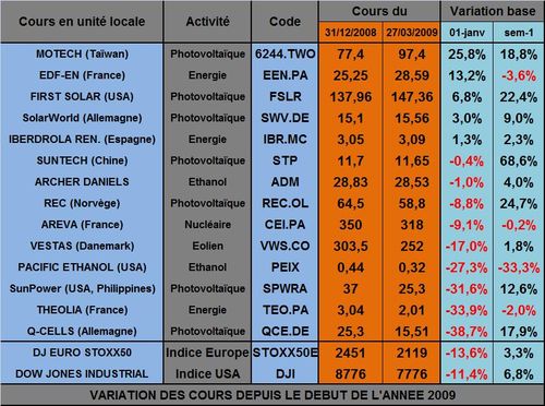 De très nombreuses unités industrielles chinoises du photovoltaïque sont en phase de lancement et de montée en cadence de leurs productions (LIRE) et cela au pire moment de la conjoncture économique, aggravée dans ce secteur par le ralentissement de la demande en Espagne qui a réduit par dix, au moins, le flux de nouvelles installations par rapport à 2008. La seule issue pour le Gouvernement chinois était donc de prendre localement en main ce nouveau marché du photovoltaïque. Il semblerait que l’affaire soit en bon chemin. Sur la nouvelle, les actions des Sociétés du photovoltaïque chinois ont accompli un superbe rebond comme en témoigne l’augmentation de cours de Suntech de 69% sur la semaine et qui rejoint ainsi son cours de début d’année. Par sympathie toutes les valeurs du secteur se sont appréciées cette semaine.