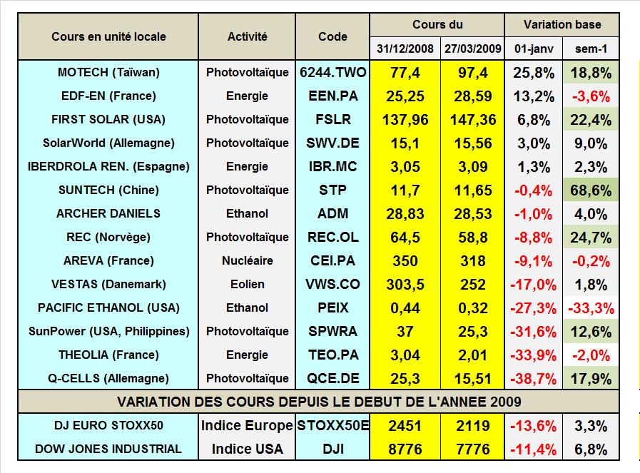 De très nombreuses unités industrielles chinoises du photovoltaïque sont en phase de lancement et de montée en cadence de leurs productions (LIRE) et cela au pire moment de la conjoncture économique, aggravée dans ce secteur par le ralentissement de la demande en Espagne qui a réduit par dix, au moins, le flux de nouvelles installations par rapport à 2008. La seule issue pour le Gouvernement chinois était donc de prendre localement en main ce nouveau marché du photovoltaïque. Il semblerait que l’affaire soit en bon chemin. Sur la nouvelle, les actions des Sociétés du photovoltaïque chinois ont accompli un superbe rebond comme en témoigne l’augmentation de cours de Suntech de 69% sur la semaine et qui rejoint ainsi son cours de début d’année. Par sympathie toutes les valeurs du secteur se sont appréciées cette semaine.