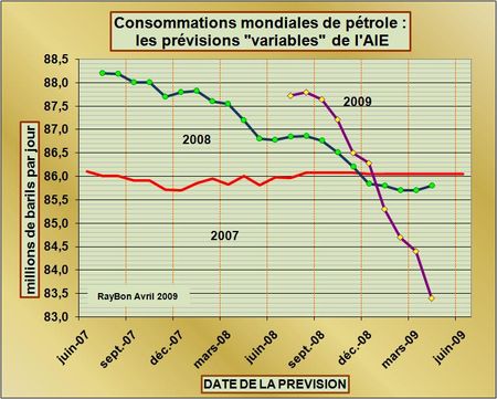 L‘AIE est une institution hautement politique en charge de la défense des intérêts des 28 Nations membres de l’OCDE et globalement consommatrices nettes d’énergies primaires. Cette institution a réalisé jusque là des prévisions mondiales de consommations de pétrole plutôt « optimistes » et parfois grossièrement ridicules qui l’obligeaient à revoir tous les mois ses prévisions à la baisse (FIG. courbe 2008), avec l’espoir de pousser l’organisation « ennemie » des producteurs qu’est l’OPEP à produire plus. Ses dernières prévisions de consommation mondiales de pétrole et de gaz liquéfiés pour 2009 qui viennent de paraître en retrait de 2,4 millions de barils par rapport à celles de 2008 marquent un tournant politique évident de cette institution.