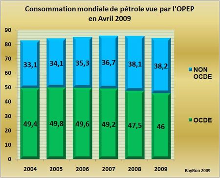 Comme prévu, l’OPEP a revu à la baisse ses prévisions mondiales de consommation de pétrole, mais n’a pas rejoint les valeurs déprimées de l’Agence Internationale de l’Energie. En effet ses prévisions demeurent supérieures à 84 millions de barils jours avec une consommation des pays OCDE à 46 millions de barils (-1,5 millions de barils par rapport à 2008) et une consommation des NON OCDE à 38,2 millions de barils, soit une très faible croissance de 0,1 million de barils/jour par rapport à 2008. C’est l’information importante qu’apporte l’OPEP ce mois-ci: les besoins en pétrole de la Chine ont baissé au cours du premier trimestre 2009 par rapport à ceux du même trimestre 2008.