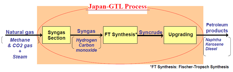 Les Japonais ont créé un pool d’entreprises intéressées par ce projet constitué de Japan Petroleum Exploration, Chiyoda (pour les catalyseurs), Cosmo Oil, Nippon Steel et Inpex côté entreprises privées ainsi que du JOGMEC (Japan Oil Gas and Metal National Corporation) côté organisation d’Etat qui a pris en compte le pilotage du projet. Chaque grande étape du projet a été réalisée soit de façon concertée, soit avec l’un ou l’autre des membres du pool en fonction de ses compétences. Inpex a étudié les possibilités de développement de certains champs gaziers, Chiyoda a formulé et optimisé les catalyseurs, Japex a réalisé certains essais, etc. Chacun à amené son expertise dans un domaine de compétence.