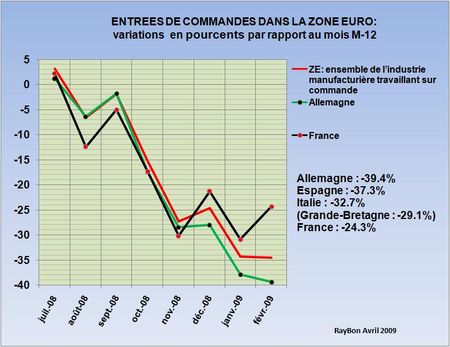 Les statistiques du mois de Février publiées par Eurostat semblent indiquer pour la Zone Euro une stabilisation globale de la dégradation des entrées de commandes à l’industrie manufacturière travaillant sur commande. La chute des commandes par rapport au même mois de 2008 apparaît à -34,5% contre -34.3% le mois précédent (FIG., courbe rouge). L’Allemagne avec -39,4% continue à s’enfoncer (courbe verte). L’Espagne et l’Italie se stabilisent à des niveaux très bas. Seule la France parmi les grands pays européens, semble avoir trouvé le fond au mois de Janvier (courbe noire). Hors Zone Euro, la Grande-Bretagne assiste à une dégradation du marasme à -29% en Février contre -24% en Janvier.