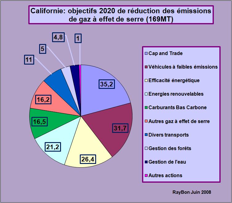 Il avait été mentionné ici, en Juin 2008, le formidable travail de compréhension, d’analyse et de projection que fournissait l’Air Ressources Board de Californie (CARB) pour tendre à définir une politique californienne tous azimuts qui permettra de réduire les émissions annuelles de CO2 de 169 millions de tonnes à l’horizon 2020. Le CARB vient de faire adopter les textes qui vont régir une petite partie de ce programme et qui concernent les Low Carbon Fuel Standard (LFCS) qui représentent 10% du total du programme (FIG. partie verte). Les textes adoptés définissent les règles du jeux complexes qui permettent de pondérer les teneurs en CO2 dans les diverses sources d’énergies utilisées dans les véhicules (essence, gasoil, biocarburants, gaz, électricité, etc.) ainsi que les modalités de progression des futurs « carburants » vers des teneurs plus faibles en CO2 et les mécanismes de marché régissant les échanges d’allocations. Bien sûr, l’adoption de ces nouveaux textes ont déclenché des cris d’orfraie auprès des milieux industriels et écologiques les plus réactionnaires. As usual!