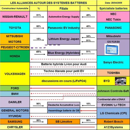 Les lecteurs du Blog Energie en sont maintenant convaincus: celui qui possèdera dans le monde le système batterie le plus performant et le moins cher, dominera le marché des véhicules électriques ou hybrides rechargeables. Formidable changement de modèle stratégique qui prend à contre pied les grands spécialistes mondiaux du moteur à explosion, incapables de se reconvertir en assembleurs d’accumulateurs, de systèmes batteries complexes et en designers de logiciels complexes de gestion de systèmes électriques de puissance. C’est donc toute une nouvelle architecture qu’ils ignorent. Il est certain que chez les grands constructeurs allemands comme Volkswagen, c’est la découverte de la profondeur du retard cumulé. Alors VW essaie de rattraper ce temps perdu avec une « approche tous azimuts ». Des batteries Ni-MH pour le premier véhicule hybride du Groupe sous la marque AUDI seront approvisionnées auprès de SANYO, du classique longuement mis au point avec Honda; puis Toshiba pourrait fournir une batterie de forte puissance au titanate de lithium pour un petit véhicule électrique, mais là c’est plus risqué et sûrement beaucoup plus cher.