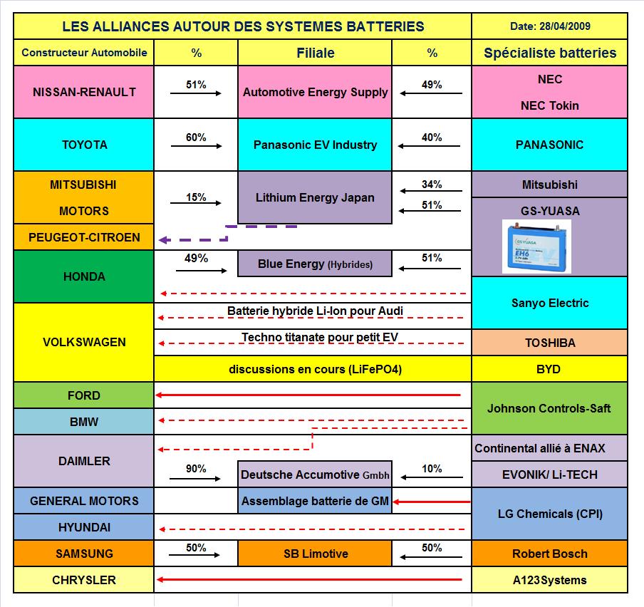 Les lecteurs du Blog Energie en sont maintenant convaincus: celui qui possèdera dans le monde le système batterie le plus performant et le moins cher, dominera le marché des véhicules électriques ou hybrides rechargeables. Formidable changement de modèle stratégique qui prend à contre pied les grands spécialistes mondiaux du moteur à explosion, incapables de se reconvertir en assembleurs d’accumulateurs, de systèmes batteries complexes et en designers de logiciels complexes de gestion de systèmes électriques de puissance. C’est donc toute une nouvelle architecture qu’ils ignorent. Il est certain que chez les grands constructeurs allemands comme Volkswagen, c’est la découverte de la profondeur du retard cumulé. Alors VW essaie de rattraper ce temps perdu avec une « approche tous azimuts ». Des batteries Ni-MH pour le premier véhicule hybride du Groupe sous la marque AUDI seront approvisionnées auprès de SANYO, du classique longuement mis au point avec Honda; puis Toshiba pourrait fournir une batterie de forte puissance au titanate de lithium pour un petit véhicule électrique, mais là c’est plus risqué et sûrement beaucoup plus cher.