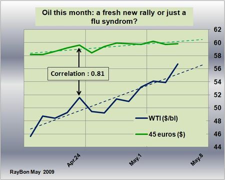 La certitude que les prix de l’énergie ne pourront pas rester longtemps à des cours bradés, que les crises économiques, même graves, connaissent toujours une fin, que le risque de voir les cours pétroliers reculer est très faible va inciter les spéculateurs à pousser les feux des cours du pétrole. Le seul débat est de savoir à partir de quel seuil le jeu s’arrêtera. Les expériences passées nous ont appris que toute prévision dans ce domaine était potentiellement erronée. Alors, 60$ disent les uns, 75$ disent les autres. Fixez vous-mêmes l’objectif, il aura autant de chance d’être réalisé que ceux-ci!