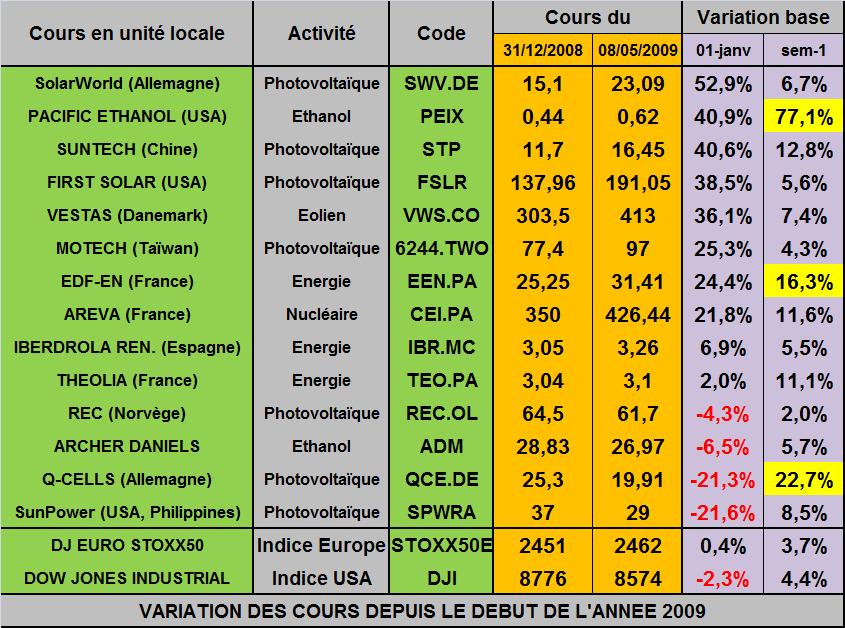 Signalons la bonne progression d’EDF EN qui vient de publier de bons chiffres d’affaires trimestriels et dont la puissance électrique éolienne à fin Mars 2009 à 1496 MW s’est accrue de 55% en un an.