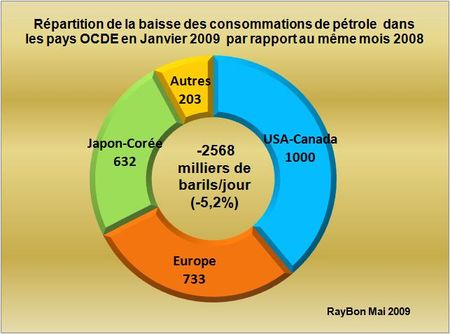 Ainsi l’Energy Information Administration américaine nous apprend qu’au mois de Janvier 2009 les consommations de pétroles dans les pays OCDE a baissé de 5,2% par rapport à celles du même mois 2008. Ceci correspond à une baisse de plus 2,5 millions de barils/jour qui est largement répartie entre les trois grandes zones Amérique du Nord, Europe et Japon-Corée (FIG.).