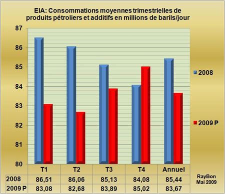 La prévision des consommations mondiales de pétrole cette année est un exercice périlleux. En effet elles vont dépendre pour une large part de la reprise éventuelle des consommations au quatrième trimestre, aussi bien dans les pays OCDE qu’en Asie. L’Information Energy Administration conserve pour l’instant une hypothèse de reprise des consommations durant le troisième et le quatrième trimestre de cette année mais elle estime globalement sur l’année que les consommations se seront amoindries de 1,8 millions de barils/jour par rapport à celles de 2008 (FIG.). La prévision 2009 revue à la baisse, à 83,7 millions de barils/jour, résultant d’une baisse des consommations de 2 millions de barils/jour dans les pays OCDE et d’une hausse de 0,2 millions de barils/jour dans les pays NON OCDE.