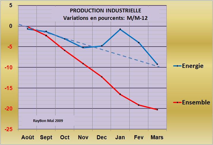 Assez paradoxalement la production industrielle des mois de Janvier et Février avait « profité » d’un poste production d’énergie plutôt favorable en raison d’un hiver rigoureux dans l’Europe du Nord. Cet effet a disparu au mois de Mars et le poste production d’énergie a rejoint sa tendance baissière accompagnant le retrait général de l’économie (FIG.). Les statistiques du mois suivant devraient profiter de la mise en place progressive des primes à la casse dans l’industrie automobile et marquer ainsi une stabilisation ou une réduction de la vitesse de déclin.