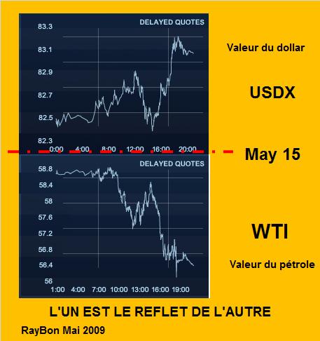 Bien des commentaires nous affirment que les prévisions déprimées de l’Agence Internationale de l’Energie sur les consommations mondiales de pétrole en 2009 sont la cause du retrait des cours du baril de WTI depuis ces derniers jours. C’est donner à cette Agence une influence qu’elle a perdu depuis belle lurette, tant ses visions furent fantasques. Personnellement je regarderais plutôt du côté des couacs de l’OPEP qui accroît ses volumes produits, de peu certes, entre 200 et 300 mille barils par jour, mais ce sont les quelques barils qui font déborder le vase. Mais surtout je voudrais, une fois de plus, essayer de vous persuader que ce sont, en ce moment, les fluctuations de la valeur du dollar qui déterminent celles des cours du baril de WTI à New York. Pour cela il est pédagogique d’examiner les variations « intraday » du baril WTI et de l’indice USDX qui pondère la valeur du dollar par rapport à un bouquet de devises (Euro, Yen, Livre Sterling, Dollar Canadien, Couronne Suédoise et Franc Suisse). La symétrie des courbes sur 20 heures de cotation est évidente (FIG.), l’un se reflète dans l’autre, miroir de la spéculation arbitrant sur la variabilité° des cours. Il semble donc que les divergences internes d’analyse au sein de la BCE qui pèsent sur le cours de l’Euro, aient une incidence sur les cours du pétrole.