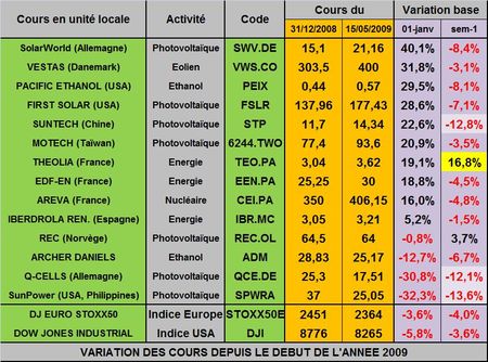 Réaction paradoxalement favorable de la cotation de THEOLIA face à des chiffres de ventes d’électricité pour compte propre au cours du premier trimestre en retrait de 27% à puissance installée au 31 Mars en croissance de 4%. La faute à la faiblesse des vents en Allemagne et en France durant le trimestre. Mais ce retrait des ventes d’énergie est plus que compensé par des ventes de fermes éoliennes pour 52 millions d’euros. Le professionnalisme de la nouvelle Direction de THEOLIA semble plaire au marché. Il faut lui souhaiter bon vent. Sur la semaine les Sociétés du photovoltaïque perdent une partie des gains accumulés les semaines précédentes. Les deux leaders Suntech et Q-Cells sont en retrait de 12% (FIG.).