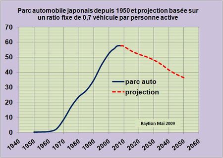 Pour mesurer la propension à consommer du véhicule à moteur des Japonais il est intéressant de rapporter la taille du parc automobile publié chaque année par la JAMA (Japan Automobile Manufacturers Association) au nombre de personnes actives. La courbe obtenue depuis 1990 et en faisant une hypothèse raisonnable de baisse du parc auto en 2008 de 124 mille véhicules à 57,5 millions d’unités, montre que ce ratio tend à se stabiliser aux environs de 0,7 voiture par personne active. Un tel ratio dans une Société fondamentalement urbaine, dont la possession d’une voiture est fortement taxée, qui le plus souvent nécessite de justifier d’un garage, société endettée par des emprunts immobiliers à très longue échéance, ne possédant au mieux que d’une voiture par foyer est tout à fait justifié.