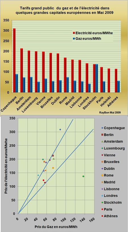 Les données publiées par la think-tank Vaasa ETT montrent qu’entre le prix grand public de l’électricité à Copenhague dans un Danemark recouvert d’éoliennes et affligé de taxes et celui d’Athènes dans une Grèce équipée de centrales brûlant le lignite local, il existe un tarif de l’électricité variant de 1 à 2,7. La Suède avec des prix très élevés du gaz naturel oriente clairement la consommation vers l »électricité d’origine nucléaire et hydroélectrique et donc peu chargée en CO2. La Grèce, la France et ses centrales nucléaires, avec des rapports de tarifs de l’ordre de deux entre le MWh électrique et celui du MWh thermique du gaz naturel tendent à favoriser l’utilisation d’électricité comme source d’énergie dans les foyers. Par contre le Danemark, la Belgique, le Royaume-Uni, l’Irlande avec des ratios supérieurs à trois tendent à favoriser l’utilisation du gaz naturel.