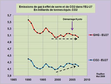 L’Agence Européenne de l’Environnement a de la chance. La crise économique 2008-2010 lui permettra de pulvériser les objectifs d’émissions de gaz à effet de serre fixés par le Protocole de Kyoto en 1997. Comme quoi, une fois de plus le bon peuple européen pourra se convaincre que « tout est pour le mieux dans le meilleur des mondes », ce dont il n’a d’ailleurs jamais douté. En attendant elle se réjouit, cette Agence, des résultats de 2007 qui marquent « une décroissance depuis trois années consécutives avec une baisse des émissions de 1,2% ou 59 millions de tonnes ». Par ces temps maussades il faut savoir se satisfaire de peu, il faut faire mousser le retrait bien faible par rapport aux 5 milliards de tonnes équivalent CO2 émises et surtout ne pas parler des émissions de CO2 qui, elles, ont été un peu moins brillantes sur les trois dernières années (FIG.).