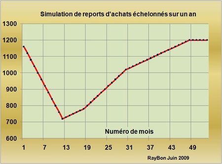 Supposons un effectif de 12 Groupes de 3600 citoyens qui remplacent régulièrement leurs voitures tous les trois ans. Le client idéal pour tout concessionnaire. Pour des raisons de climat économique, de finances personnelles, de difficultés rencontrées pour obtenir un crédit ou de nouveaux choix de mode de vie nous allons supposer qu’au sein de chacun des groupes 60% des individus ne changent rien à leur comportement, 10% vont repousser leur achat de 12 mois, 10% de 18 mois, 10% de 24 mois et 10% de 36 mois. Un à un, chacun des groupes va accéder à ce nouveau mode de consommation échelonné sur 12 mois. Ceci permet de simuler l’impact de nouvelles contraintes échelonné sur un an au sein d’une population. Les achats de voitures de ces 43200 citoyens qui auparavant achetaient régulièrement 1200 voitures par mois sont représentés par la FIG.I.