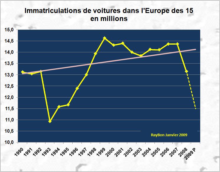 Cette courbe montre la chute régulière des ventes sur un an qui est notre hypothèse, mais elle montre surtout la lenteur de la remontée échelonnée sur trois ans qui est la caractéristique des sorties de crises de ventes de voitures (on suppose naïvement ici que la crise passée tout le monde reprend son rythme antérieur d’achat). La lente reprise des ventes européennes après la crise de 1993 est un exemple de ce phénomène de rétablissement lent (FIG.II).