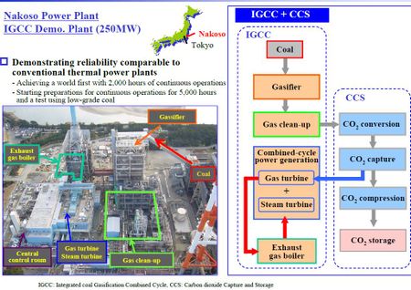 Mitsubishi Heavy Industries (MHI) est un acteur mondial majeur dans le domaine des équipements pour l’énergie. Avec un chiffre d’affaires 2008 de sa Division Power Systems en croissance de 28% à 12 milliards de dollars, MHI affiche ses ambitions de vouloir s’impliquer dans tous les domaines qui touchent à l’énergie et à ses préoccupations environnementales. Acteur majeur dans les centrales à gaz à cycle combiné, familiarisé avec le captage du CO2 grâce à ses unités de production d’urée, MHI gère un projet de démonstration d’une unité pilote de 250 MW de type IGCC dans laquelle le charbon qui sert d’énergie primaire est préalablement gazéifié. Cette unité de Nakoso, à côté de Tokyo, a déjà fonctionné durant 2000 heures. Elle va démarrer un programme de production de 5000 heures qui doit utiliser divers types de charbons de basse qualité. L’objectif final est de coupler cette centrale avec une unité de captage du CO2 (FIG.I).