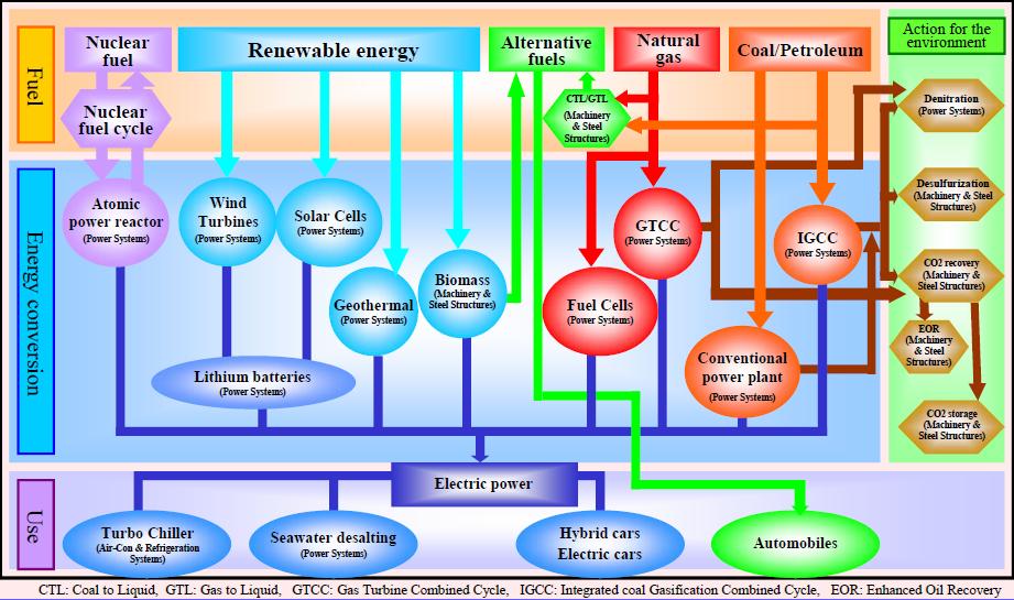 Mitsubishi Heavy Industries (MHI) est un acteur mondial majeur dans le domaine des équipements pour l’énergie. Avec un chiffre d’affaires 2008 de sa Division Power Systems en croissance de 28% à 12 milliards de dollars, MHI affiche ses ambitions de vouloir s’impliquer dans tous les domaines qui touchent à l’énergie et à ses préoccupations environnementales. Acteur majeur dans les centrales à gaz à cycle combiné, familiarisé avec le captage du CO2 grâce à ses unités de production d’urée, MHI gère un projet de démonstration d’une unité pilote de 250 MW de type IGCC dans laquelle le charbon qui sert d’énergie primaire est préalablement gazéifié. Cette unité de Nakoso, à côté de Tokyo, a déjà fonctionné durant 2000 heures. Elle va démarrer un programme de production de 5000 heures qui doit utiliser divers types de charbons de basse qualité. L’objectif final est de coupler cette centrale avec une unité de captage du CO2 (FIG.I).