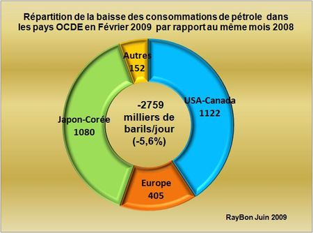 Les consommations japonaises de pétrole en Février 2008 avaient été importantes en raison du froid et de l’indisponibilité de certaines centrales nucléaires. En Février 2009 cette consommation japonaise à 4,7 millions de barils/jour est en baisse de 1,2 millions de barils/jour par rapport au même mois 2008, soit une baisse de plus de 20%. Pour l’ensemble des pays de l’OCDE la baisse des consommations de pétrole ressort à 5,6%, soit une chute des consommations de près de 2,8 millions de barils par jour (FIG.). L’Europe qui consomme des produits pétroliers pour se chauffer, ne participe que faiblement à cette décroissance. L’Allemagne et la France en particulier, s’illustrent par des consommations en hausse. (Source: EIA)